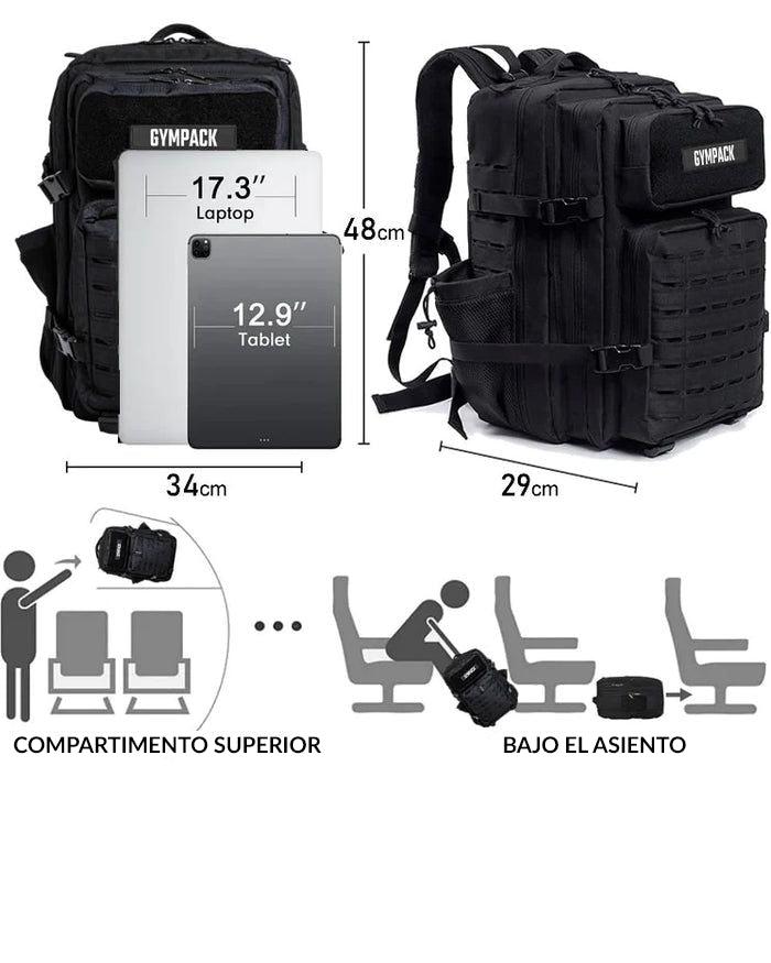 La Gympack PRO es la mochila ideal para transportar todo tu equipamiento para entrenar, viajar o el día a día. Sus dimensiones son: 48cm x 34cm x 29cm y está probado para soportar cargas de hasta 30kg.